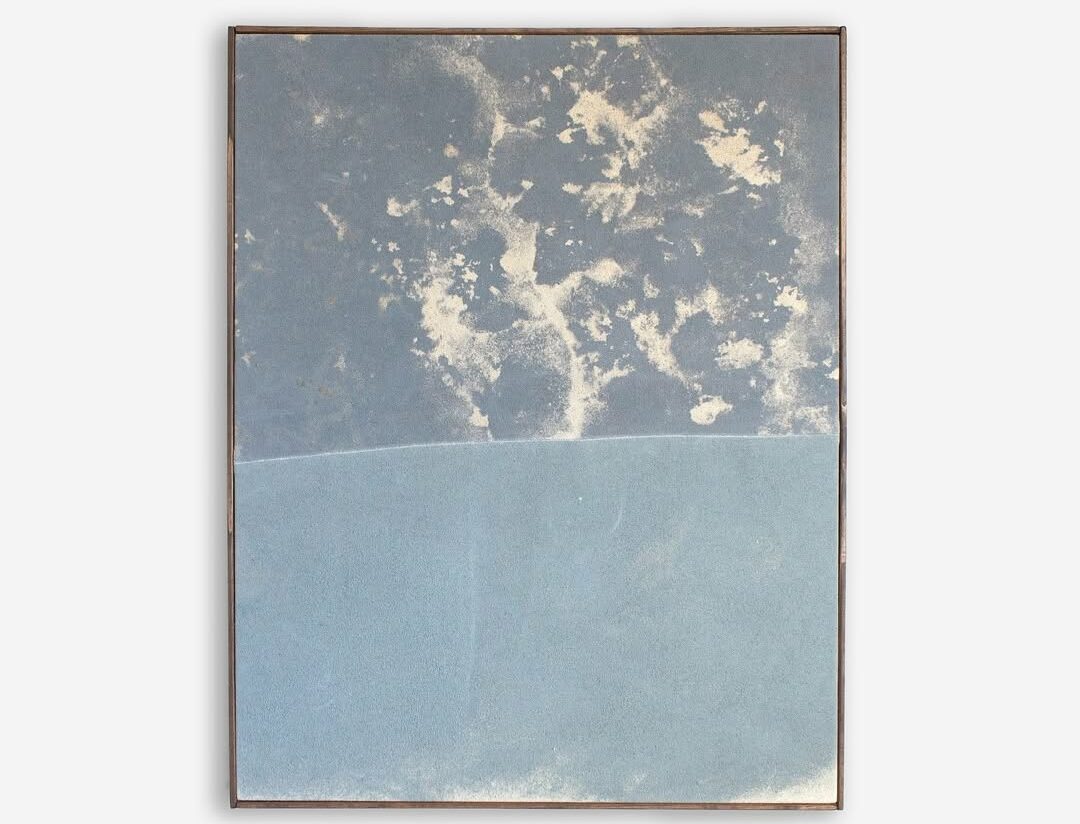 Viktor Kobylianski, Sunburns (blue&ochre), 2025, mineral dust, pigments, cotton, 18×14 in (approx. 46×36 cm) © The Artist