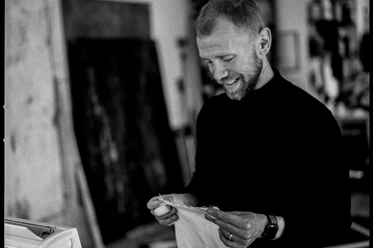 My studio routine is quite steady, and the work usually begins very simply. I work on unstretched raw canvas and linen directly on the floor, often layering multiple pieces — for example, two layers of canvas and two layers of linen. I only work on the top layer, but what interests me just as much is what happens underneath. On the backside of the fabric, these “ghost” images and unintentional drawings begin to appear, and they often become the starting point for the next painting.
