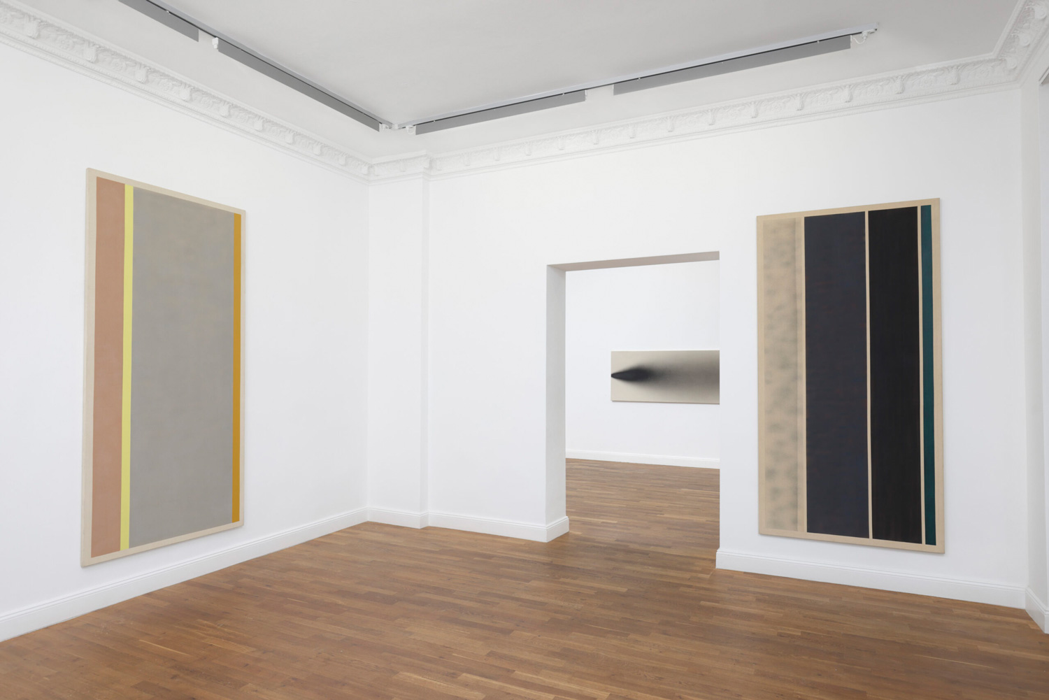 One of the central works in the exhibition is the large-format black canvas Untitled, created in New York in 1971 as part of the “Spray Paintings” series. Michael Venezia worked on the canvas from both edges with seven even spray bursts. He used an emulsion of aluminum pigments and acrylic paint, which he sprayed onto the horizontal canvas before stretching it.